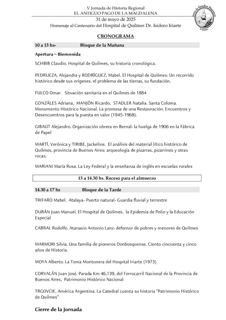 Compartimos a continuación el Cronograma de la V Jornada de Historia Regional “El Antiguo Pago de la Magdalena”, que se realizará el día sabado 31 de Mayo de 10 a 17 horas en la Casa de las Culturas, Rivadavia esquina Sarmiento, Quilmes.